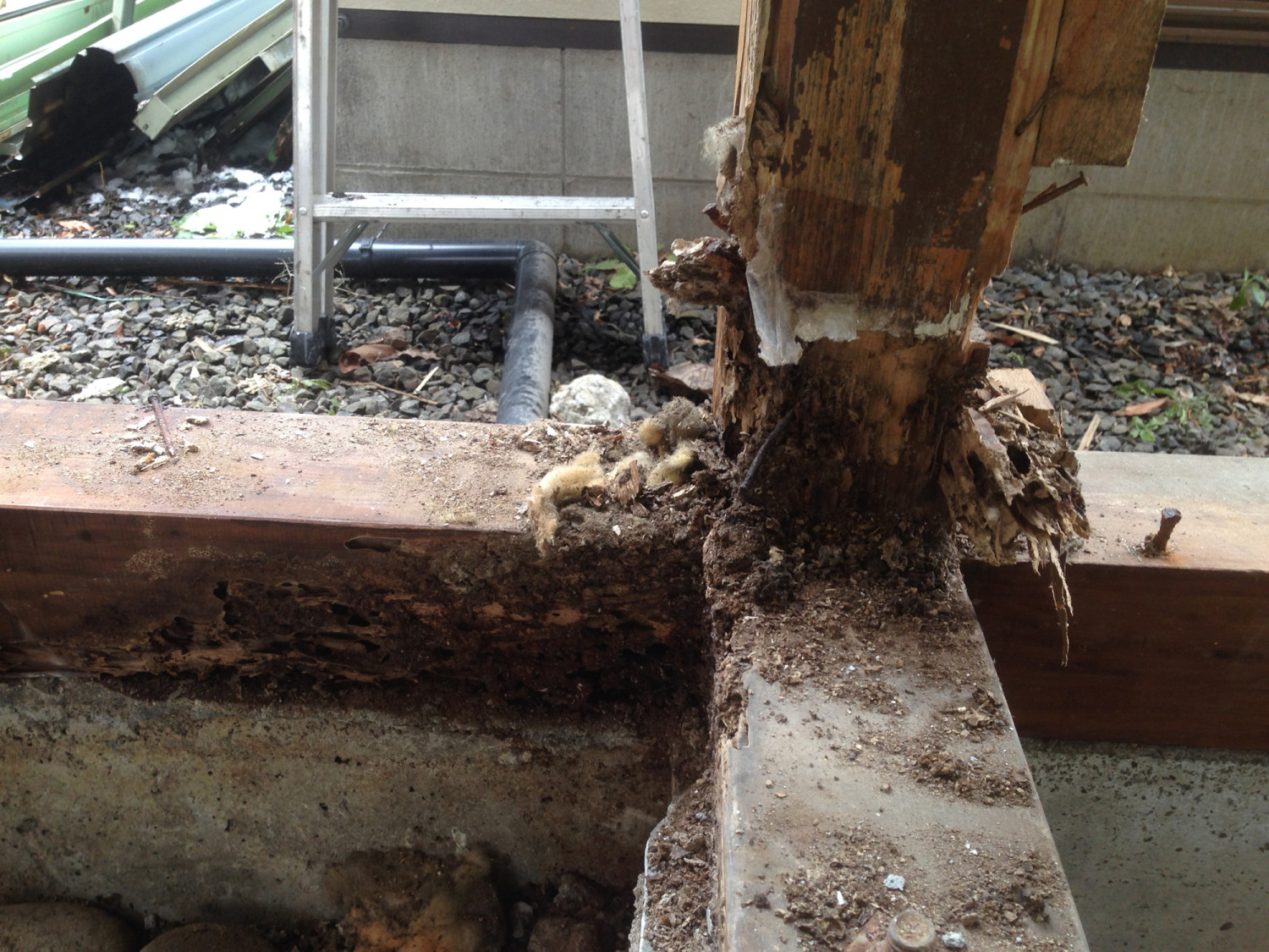 1階部分は柱、筋交いを撤去し躯体を確認しましたが、おおよそこのくらいの築年数に多く見られるのはシロアリの被害や水回り部分の土台の腐食。この建物も腐食が見られたので撤去・交換を行い補強を行いました。
