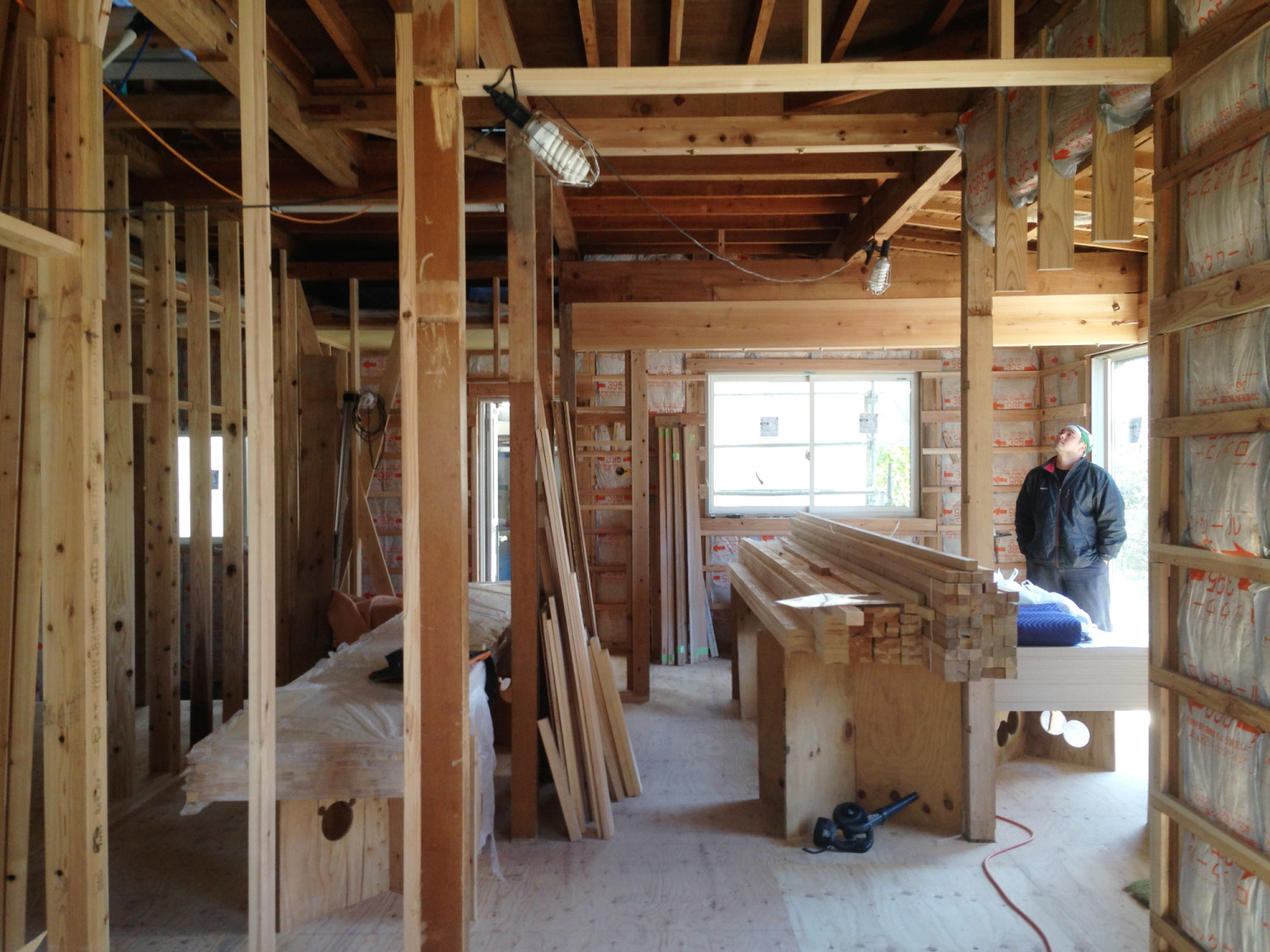 現在大工工事がほぼ完了しいよいよ仕上げ工事に突入しました。これからお施主様による壁塗装や植栽のDIYもはじまります。作る事を共に楽しみながらの家づくり。