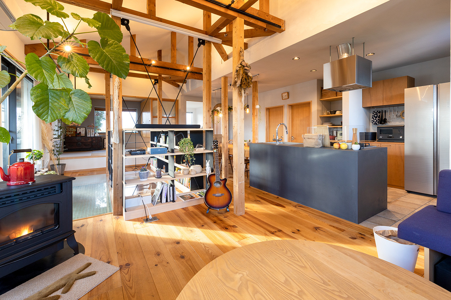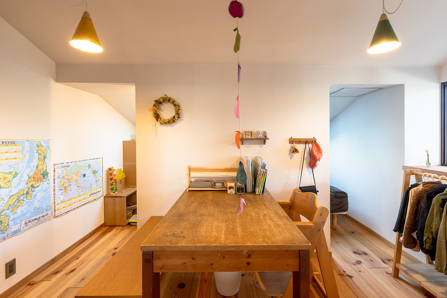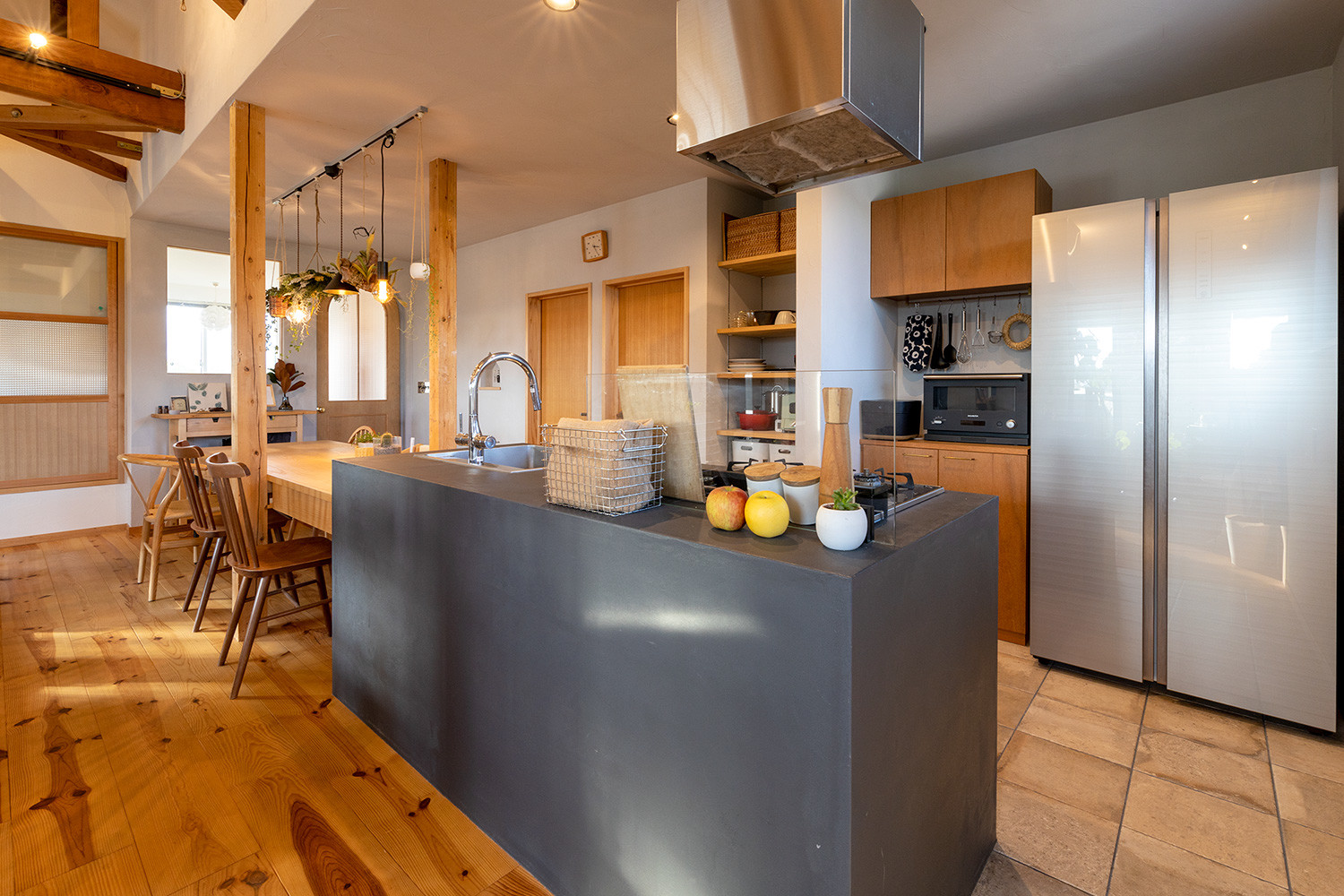 リノベーションをする前、2階は壁で部屋が仕切られていました。ところが今は、階段を上がって扉を開けると大きな空間が広がります。空間の印象をつくる建具やインテリアからは、夫婦がこだわりを持ちながら楽しんで選んできたのが伝わるものばかり。