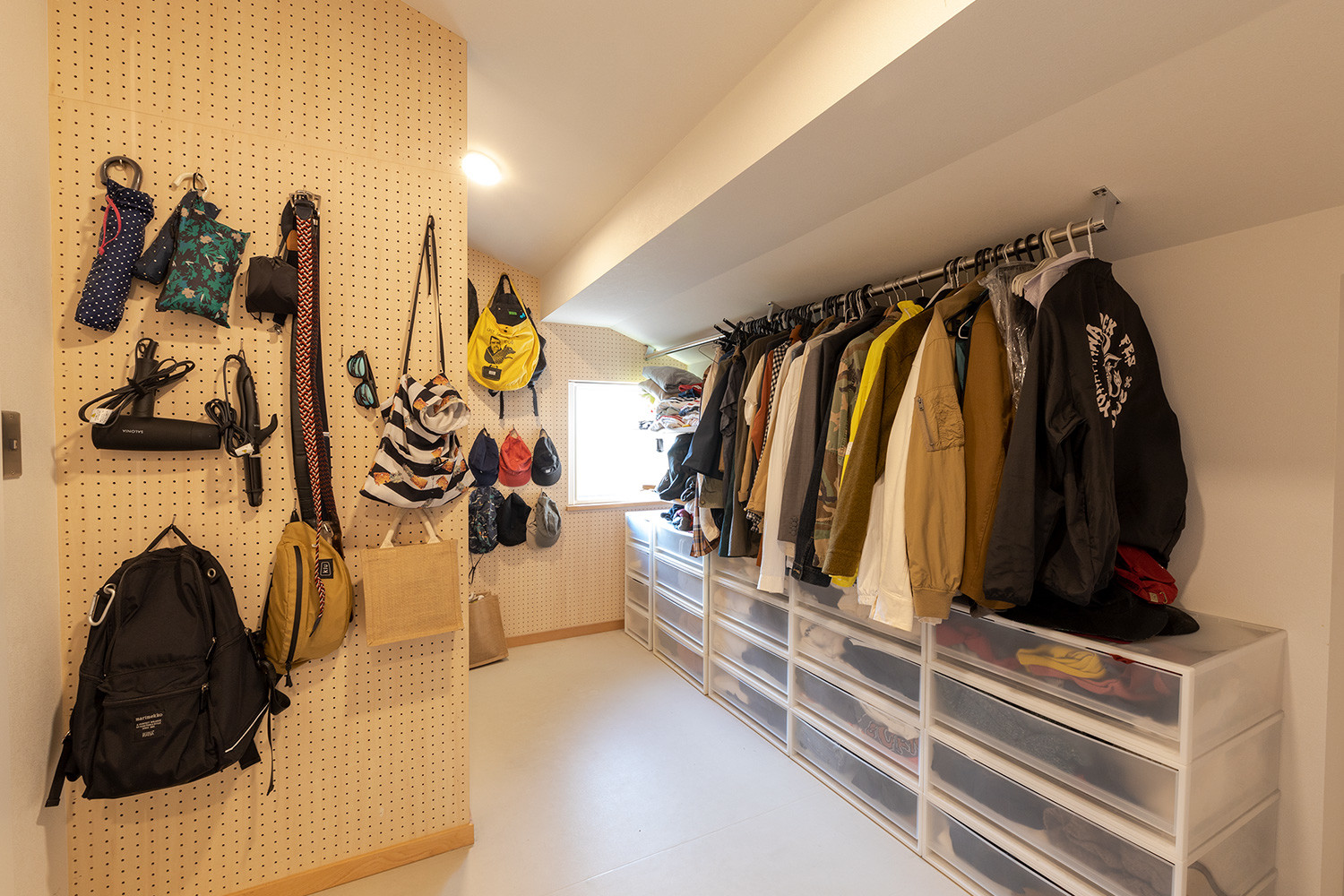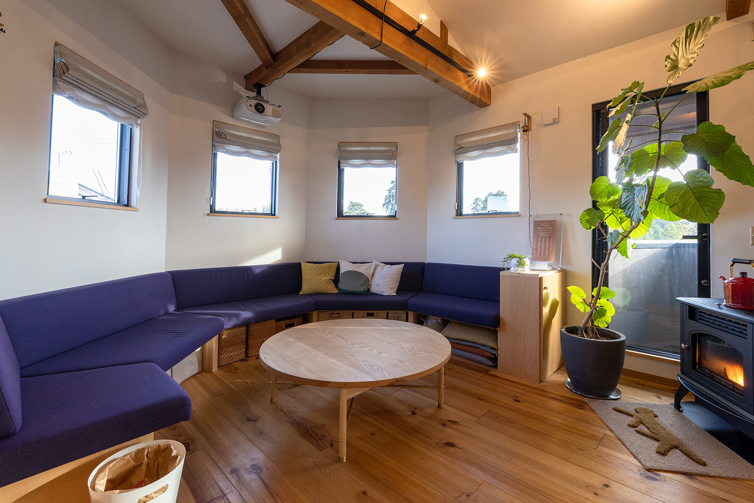 この家の象徴ともいえる六角形のスペースは2階の空間でもアクセントに。壁に沿ってベンチが置かれていて、暖炉を前に家族が集まれる場所になりました。ダイニングや和室の小上がりなど、さまざまな“居場所”を配置しているのと同時に、子どもたちのための個室も設けられています。