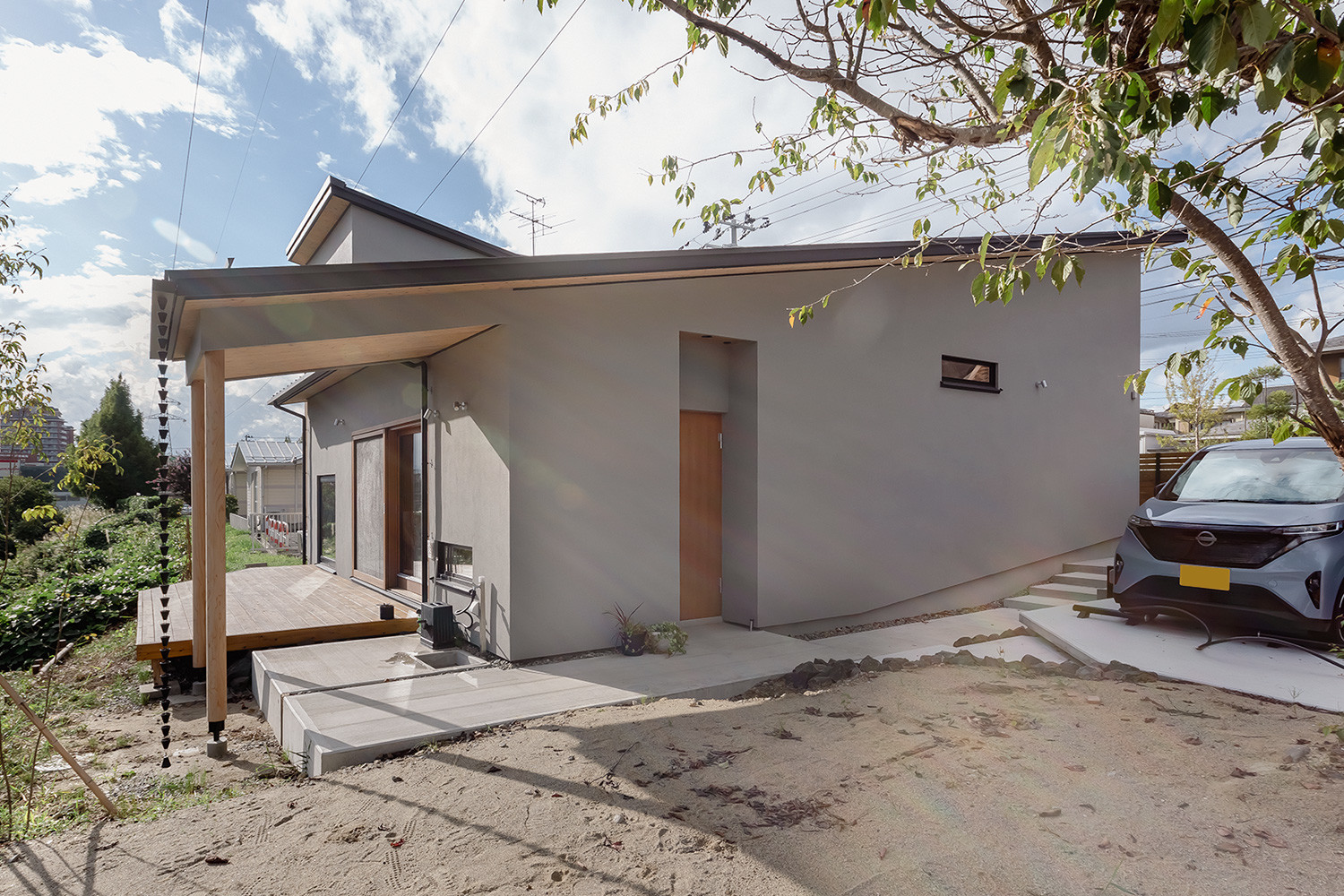 なるべく環境に負荷をかけない暮らし方を模索して、日当たりがよく緑の景観が広がるこの土地と巡りあいました。建築の機能性にこだわり、太陽光発電や蓄電器、電気自動車を導入して初めて過ごした夏は、以前より電気代やガソリン代を減らすことができたそう。