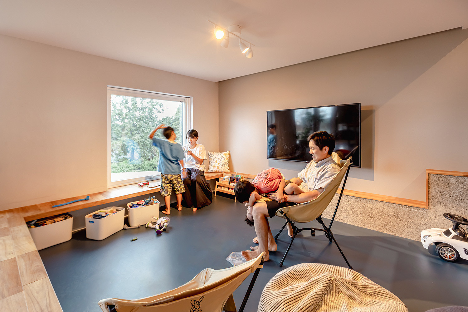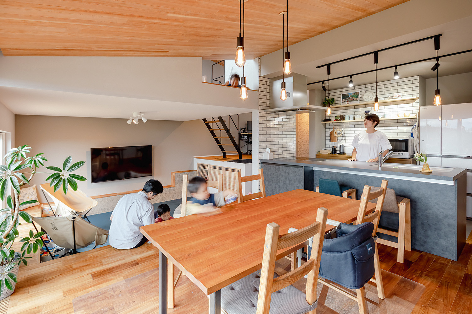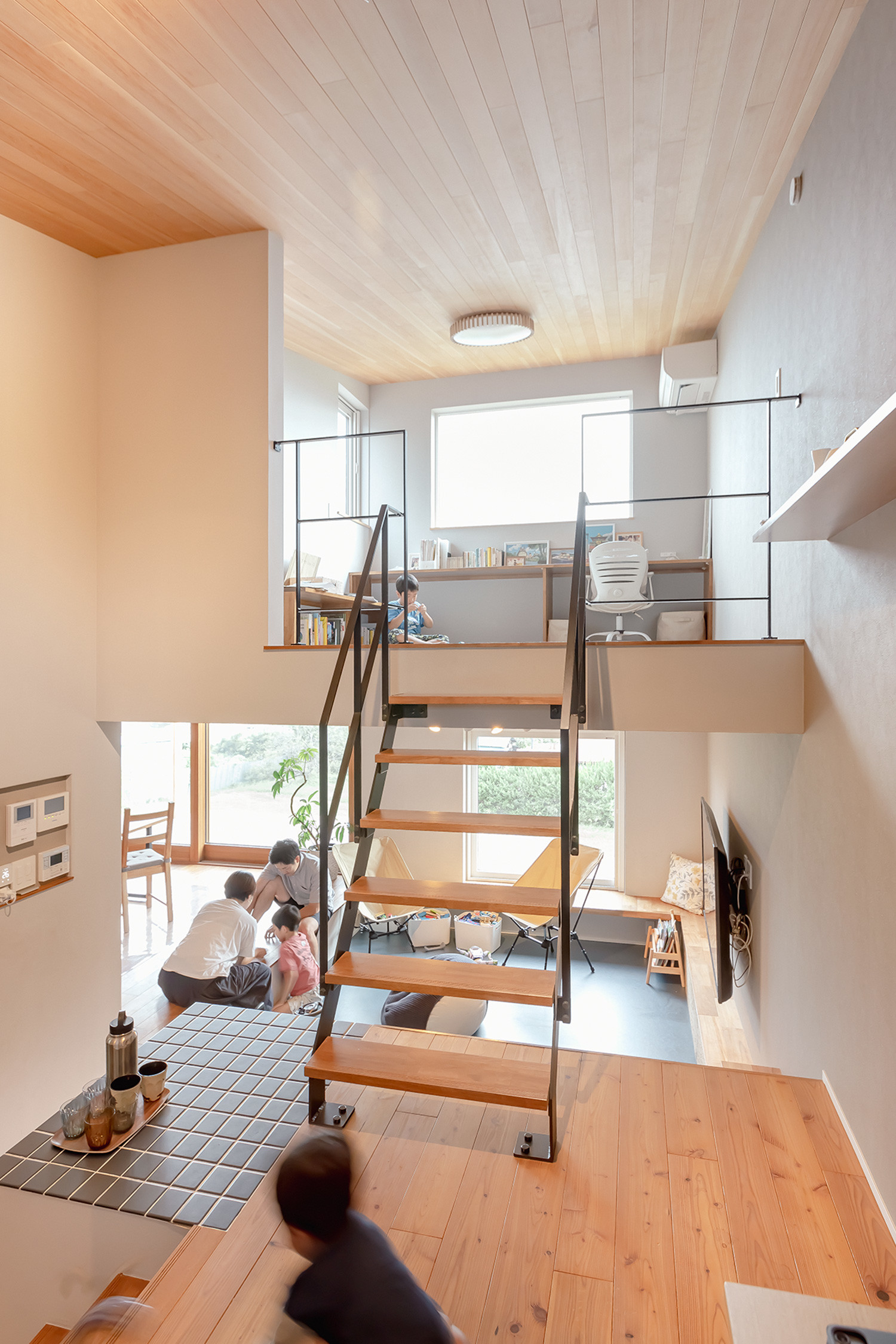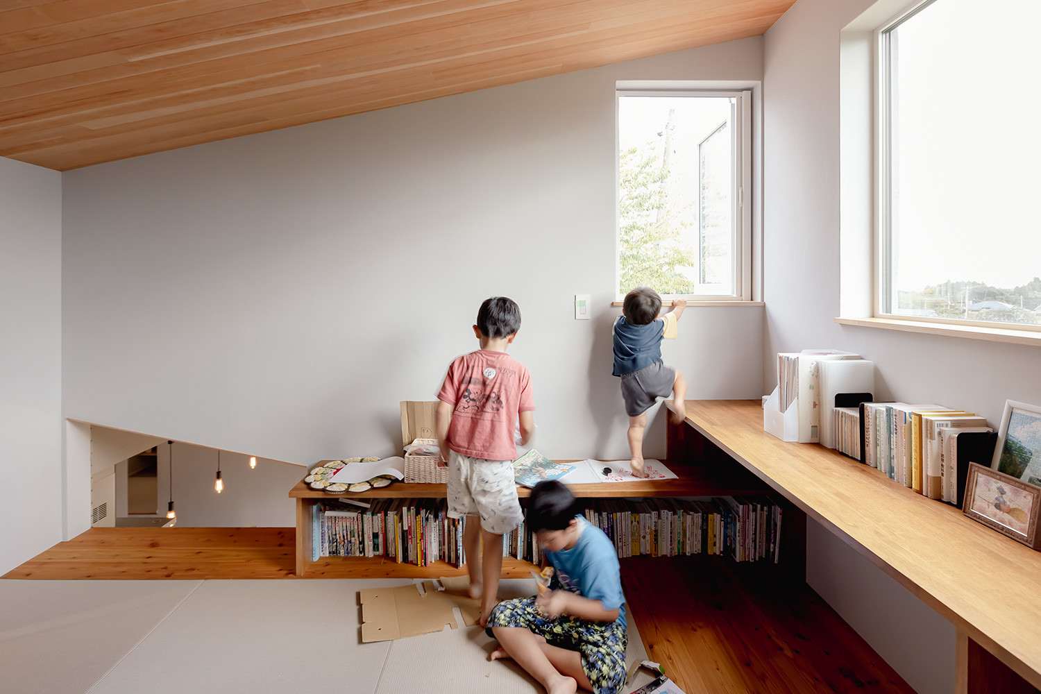 壁や扉で部屋を分けるかわりに床の高さに変化をつけたことで、ひとつづきの空間でありながら「なにをどこでするか」のメリハリが生まれました。子どもたちの成長によって場所の役割が変化していくのも楽しみの一つです。