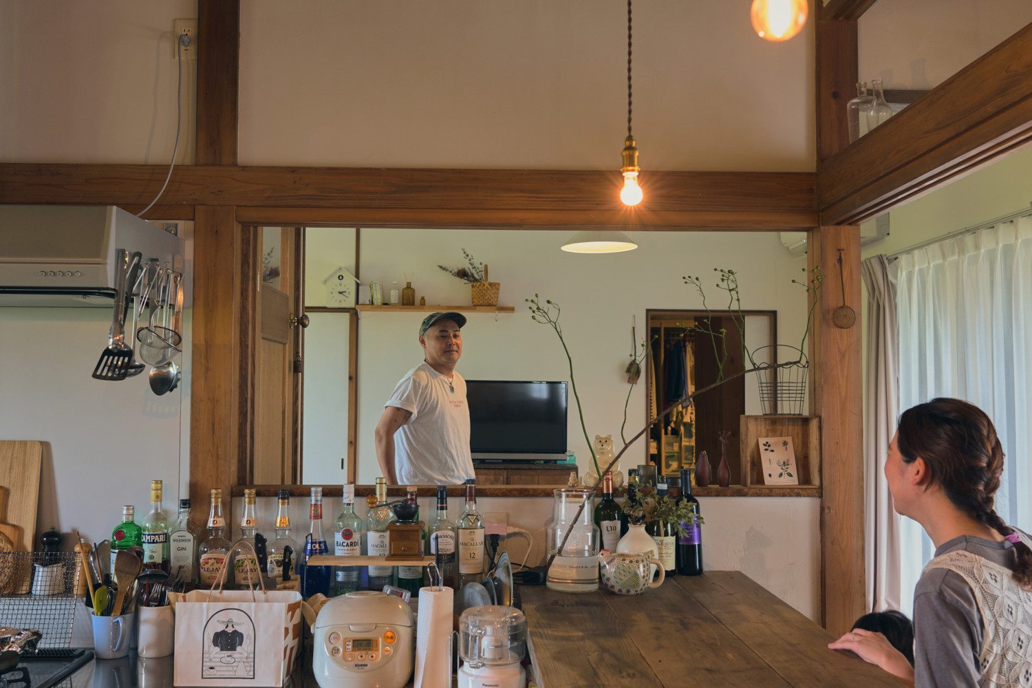 この住まいの顔となるのが、L字型のカウンターで囲まれたキッチン。ずらりと並ぶ食器やグラスのオープン収納で、飲食店のような趣を演出。古材カウンターの風合いと、既存の鴨居や柱の存在感をうまく調和させながら、落ち着きのある空間にしました。