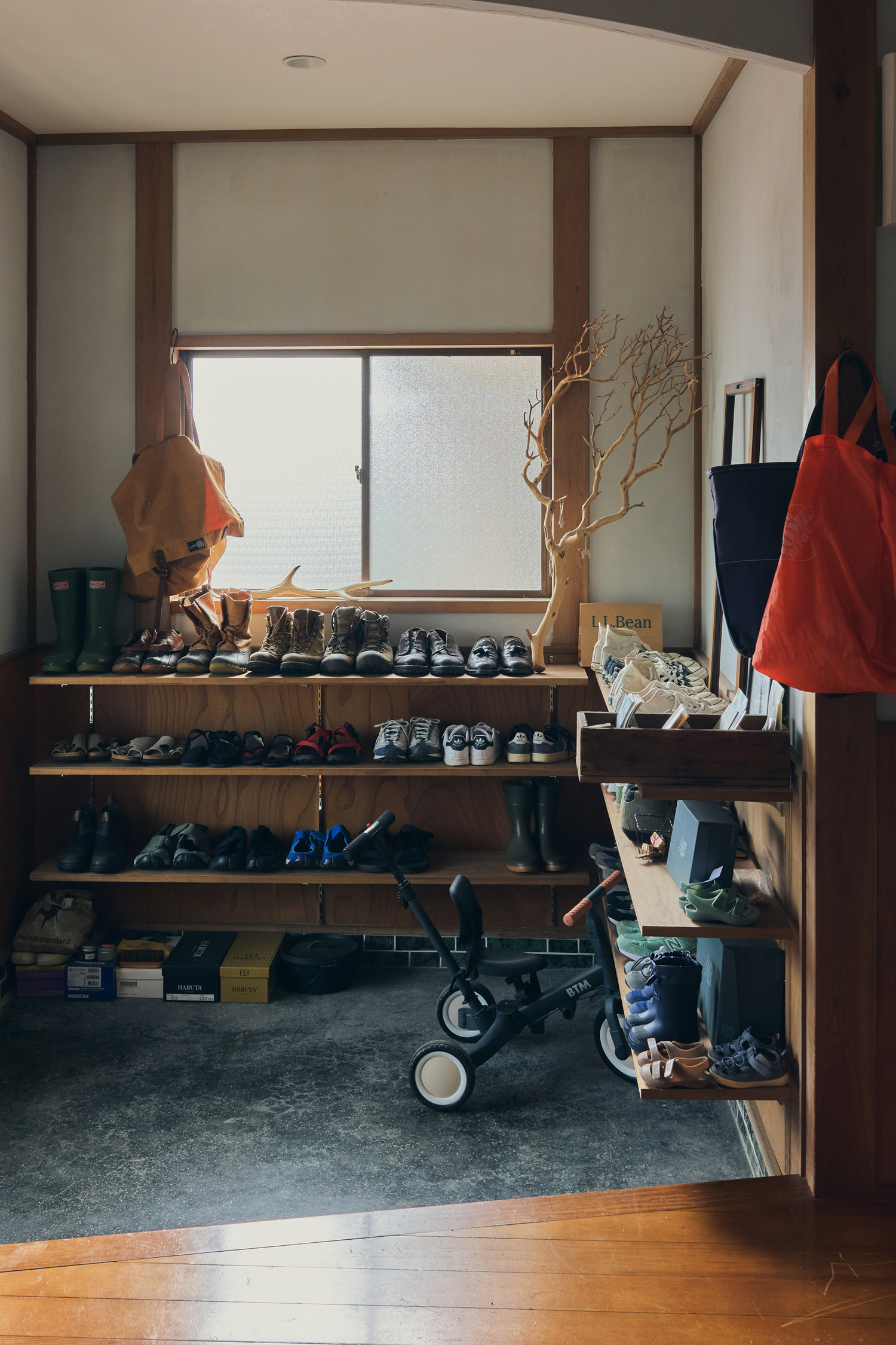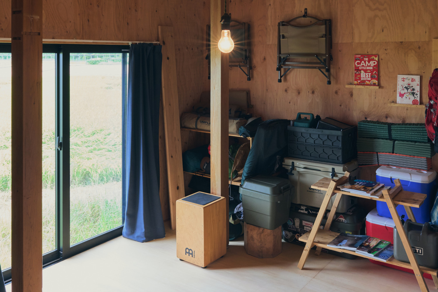 板張り仕上げの一室にはキャンプ道具を収納。夫がDIYで、壁に道具を引っ掛けたり飾ったりと工夫を重ね、使いながら手を加える“育てる住まい”のスタイルが自然と根づいています。