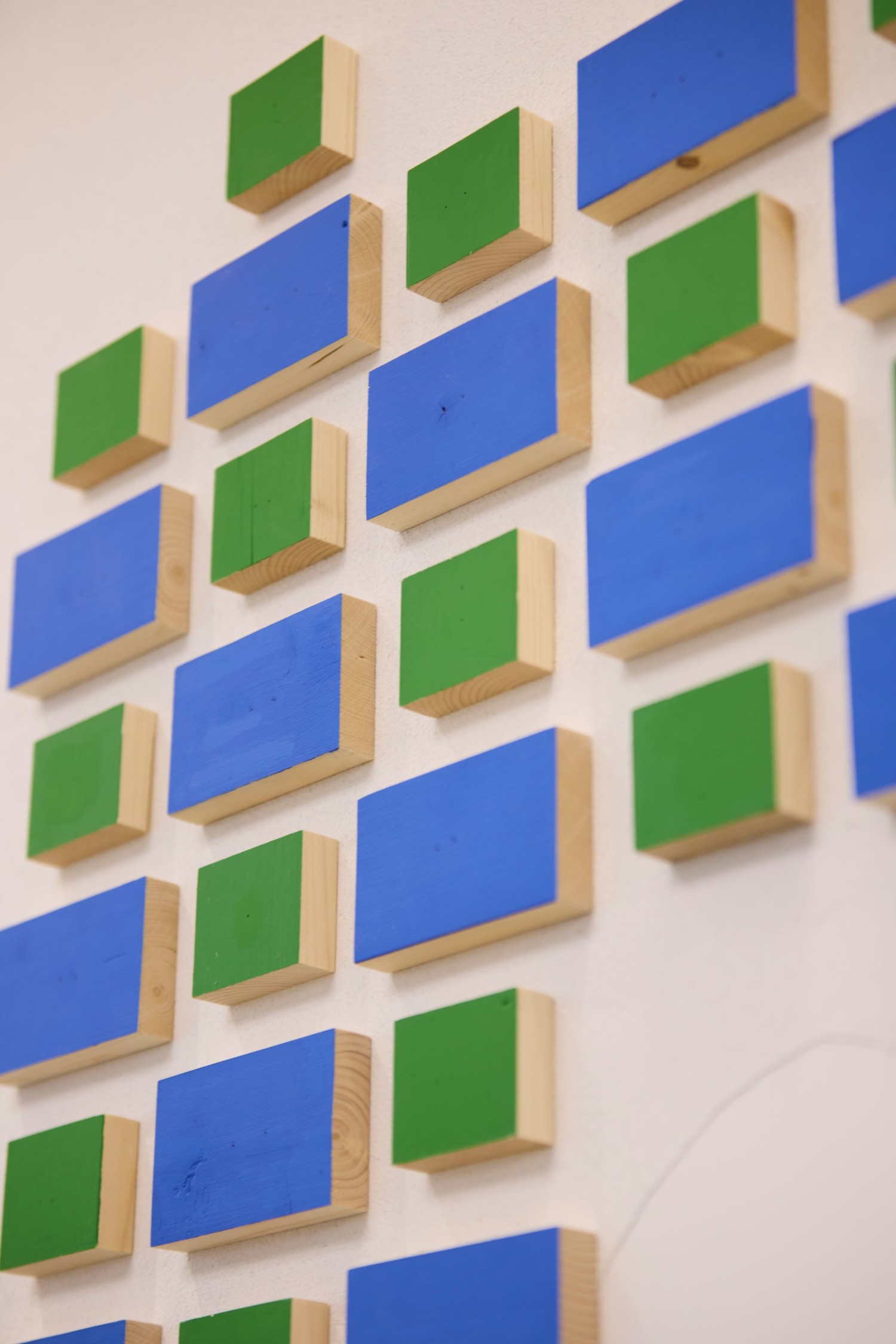 内部は断面的な構成とし、下層を「海・川」、上層を「山・大地」と捉えて色彩を整理。淡いブルーの什器が“海面”のように連続し、その上に商品が浮かび上がる構図としています。既存天井は活かしつつも、緑の鉄骨格子を加えることで編集可能な構造としました。